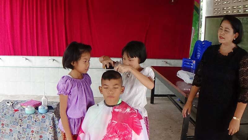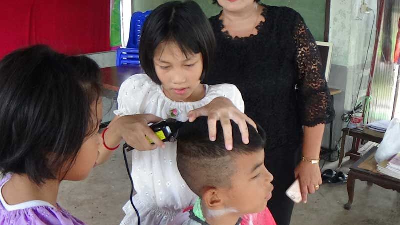 โดยสุดยอดฝีมือตัดผมเป็นนักเรียนหญิง 2 คน เรียนอยู่ชั้นประถมปี่ที่ 4 คือ เด็กหญิงอรปรีญา ปานแย้ม อายุ 9 ปี และเด็กหญิงดารุณี อินทราราช อายุ 10 ปี ที่ได้รับการฝึกฝนจากทางผู้อำนวยการโรงเรียนจนกระได้รับการยอมรับของนักเรียนชายทั้งโรงเรียน พร้อมเผยว่า “รู้สึกดีใจมากและชอบมากที่ได้เรียนรู้การตัดผมและจะพัฒนาไปใช้ในอนาคต”