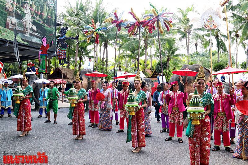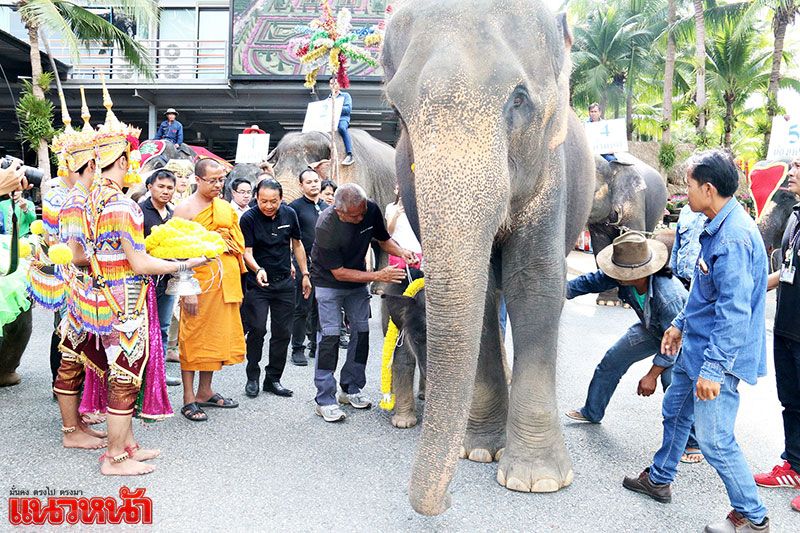 โดยในพิธีรับขวัญช้างได้นิมนต์ พระครูเกษมกิตติโสภณ (อาจารย์จ่อย) เจ้าอาวาสวัดสามัคคีบรรพต บางเสร่นอก ต.บางเสร่ อ.สัตหีบ จ.ชลบุรี ทำพิธีสวดชัยมงคลคาถา เจิมหน้าผากรับขวัญลูกช้าง ประพรมน้ำพระพุทธมนต์เพื่อความเป็นสิริมงคล พร้อม ขบวนโนรา หนังตะลุง ศิลปะทางภาคใต้ของไทย เล่นรับขวัญท่ามกลางช้างนักแสดงรุ่นพี่ที่มาร่วมรับขวัญอีกด้วย