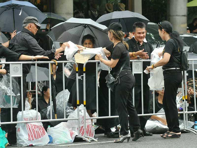 ด้าน นางธนวันต์ ไชยโย อายุ 60 ปี อาชีพทำตุ๊กตาขาย ร้านแม่ขวัญ ต.บ้านสิงห์ อ.โพธาราม จ.ราชบุรี กล่าวว่า เดินทางมาพร้อมกับน้องชายและญาต มาถึงจุดคัดกรองหน้าโรงแรมรัตนโกสินทร์ช่วงบ่าย 3 โมง ของวันที่ 24 ต.ค. เปียกฝน 3 รอบก็ไม่กลัวเพราะทุกคนก็เปียกเหมือนกันพวกเราตั้งใจมาเพื่อพระองค์ท่าน ที่จังหวัดราชบุรีมีโครงการในพระราชดำริเขาชะงุ้ม เมื่อครั้งดินเสียพ่อหลวง รัชกาลที่ 9 ท่านก็เสด็จไปแก้ไขให้ ส่วน จ.เพชรบุรี ก็มีโครงการชั่งหัวมัน พระองค์ท่านทรงเป็นแบบอย่างที่ดีทั้งเรื่องความขยัน ประหยัด ทำให้ชาวบ้านมีอาชีพนับเป็นพระมหากรุณาธิคุณอย่างหาที่สุดมิได้