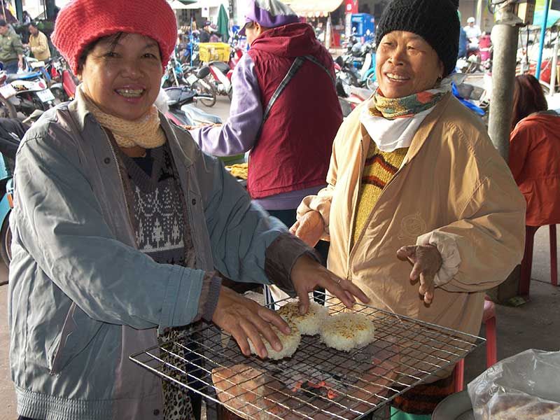 นางศิริพร ทำงาน อายุ 40 ปี อยู่บ้านเลขที่ 14 หมู่ที่ 6 ต.บุ่ง อ.เมืองอำนาจเจริญ จ.อำนาจเจริญ แม่ค้าขายข้าวจี่สมัยใหม่ บอกว่า ตามปกติก็จะขายอาหารเวียดนาม ที่ถ่ายทอดมาจากพ่อแม่ ซึ่งย้ายมาจากประเทศเวียดนาม เช่น ข้าวต้มมัด มีลักษณะคล้ายข้าวต้มประเทศไทย แต่ของเวียตนามจะเป็นแบบสามเหลี่ยม มีไส้เป็นถั่วเหลืองผสมกับหมู จะมีรสชาติหวานมัน แปลกกว่าข้าวต้มมัดทั่วไป ซึ่งข้าวต้มเวียดนามจะขาย 3 อัน 20 บาท และขนมปากหม้อ บรรจุกล่องๆละ 20 บาท ส่วนขนมที่โดดเด่นยอดนิยมในช่วงนี้และมีลูกค้าซื้อมากที่สุด ก็คือข้าวจี่สมัยใหม่ ซึ่งก็มีจำหน่ายที่นี่เช่นกัน โดยจะทำขายเฉพาะอากาศหนาวเย็นเท่านั้น ในราคา 3 ก้อน 20 บาท