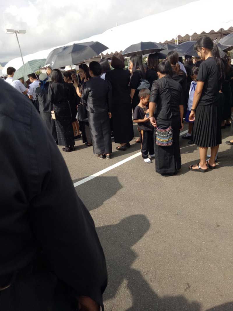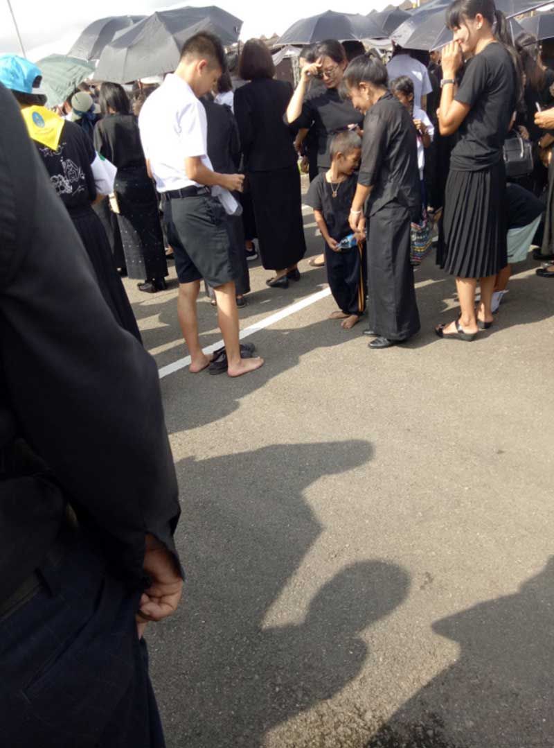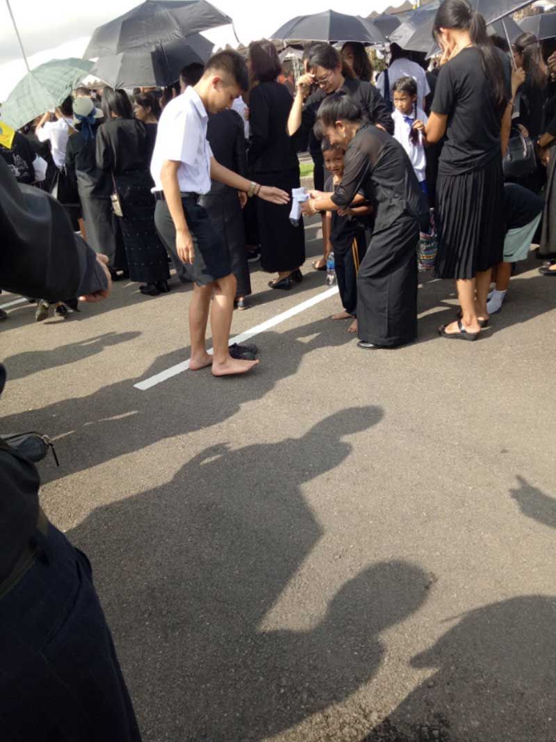 อีกหนึ่งเรื่องราวแสนประทับใจที่เกิดขึ้นในห้วงเหตุการณ์ประวัติศาสตร์ พระราชพิธีถวายพระเพลิงพระบรมศพฯ รัชกาลที่ 9 เรื่องราวดังกล่าวถูกแชร์ผ่านผู้ใช้ทวิตเตอร์ chillchill25809 โพสต์ภาพนักเรียนชายคนหนึ่ง กำลังถอดถุงเท้าให้กับเด็กน้อยที่ไม่ได้สวมรองเท้ามายืนรอเข้าร่วมพิธีถวายดอกไม้จันทร์ท่ามกลางแดดร้อนจ้าในพื้นที่มณฑลพิธีท้องสนามหลวง