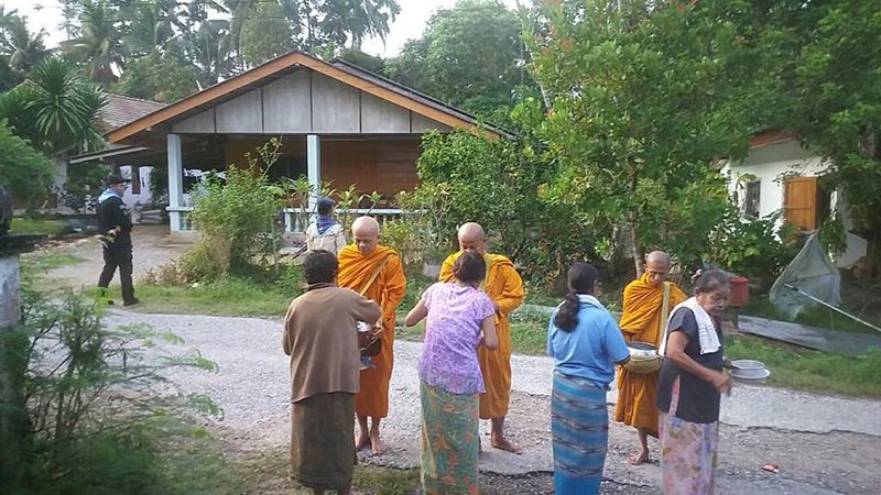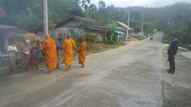 ภาพชาวพุทธ ออกมารอใส่บาตรพระสงฆ์ ที่ออกเดินบิณฑบาต โดยมีเจ้าหน้าที่คอยรักษาความปลอดภัยพระสงฆ์ เป็นเรื่องที่คนในพื้นที่ เห็นจนชินตา รวมถึงในพื้นที่ บ.กาหลง ม.1 ต.กาหลง อ.ศรีสาคร จ.นราธิวาส