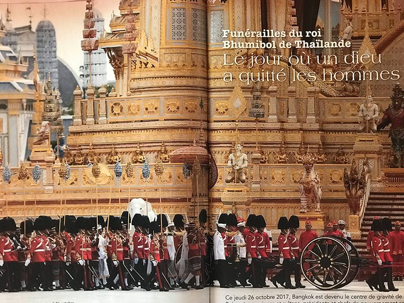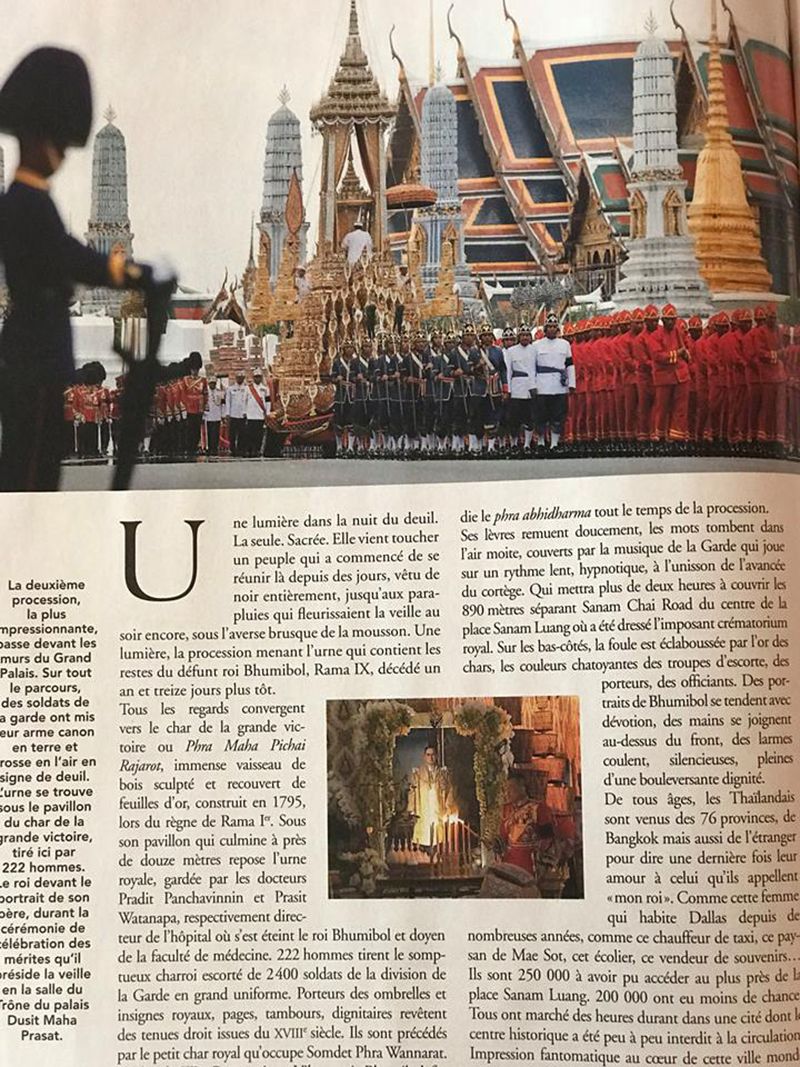 ทางนิตยสารได้อุทิศหน้า 16-25 ทั้งหมด 10 หน้าเพื่อร้อยเรียงเรื่องราวเกี่ยวกับงานพระราชพิธีที่จัดขึ้นอย่างสมพระเกียรติเพื่อให้ชาวฝรั่งเศสได้อ่านและรับทราบกันถึงความรักและการถวายความอาลัยอย่างหาที่สุดมิได้ของปวงชนชาวไทยแด่องค์พ่อหลวง โดยบรรยายไว้ตั้งแต่หน้าแรกว่าพระบาทสมเด็จพระปรมินทรมหาภูมิพลอดุลยเดช บรมนาถบพิตรเสด็จสู่สวรรคาลัย และ “วันพฤหัสบดีที่ 26 ตุลาคม พ.ศ. 2560 กรุงเทพฯ ได้กลายเป็นศูนย์กลางของความอาดูรทั้งปวงบนโลกใบนี้”