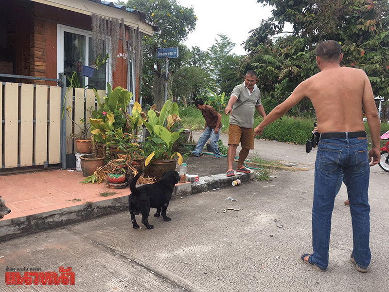 นายหน่อง อ้อคำ ชาวชุมชนเคหะ เล่าว่า ได้ยินเสียงหมาเห่าผิดปกติที่บ้านหลังดังกล่าว ซึ่งเจ้าของบ้านไม่อยู่ ตนกับเพื่อนบ้านจึงออกมาดู ก็พบหมาดำ ชื่อว่า หมีอ้วน และหมาตัวขาว ชื่อว่า กาหลง ซึ่งเป็นหมาไม่มีเจ้าของแต่ชาวบ้านช่วยกันเลี้ยงไว้ ส่งเสียงเห่าไม่หยุดบริเวณคอมเพรสเซอร์แอร์ จึงส่องดูเห็นงูขดอยู่ข้างใน ก็เลยนำน้ำยาฆ่าแมลงมาฉีด ทำให้งูเลื้อยออกมา เจ้าหมีอ้วนรีบวิ่งเข้าไปขย้ำคองูตัวนี้ทันที จนงูลักษณะคล้ายกับงูเห่าตาย ซึ่งครั้งนี้เป็นครั้งที่สามแล้วที่เจองูในลักษณะเช่นนี้ เนื่องจากบริเวณใกล้เคียงเป็นป่าละเมาะและเป็นบ้านไม่มีคนอยู่มีหญ้าขึ้นรก อาจเป็นที่หลบซ่อนของงู โดยสองครั้งก่อนหน้านี้ก็เจองูบริเวณใกล้เคียงกัน ก็ได้เจ้าหมีอ้วน ช่วยกำจัดงูให้ จนตาข้างขวาของเจ้าหมีอ้วนถูกพิษงูทำให้ตาบอดไปข้างหนึ่ง เหลือตาซ้ายที่ใช้การได้.