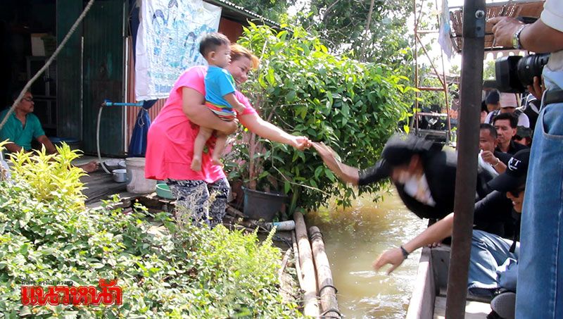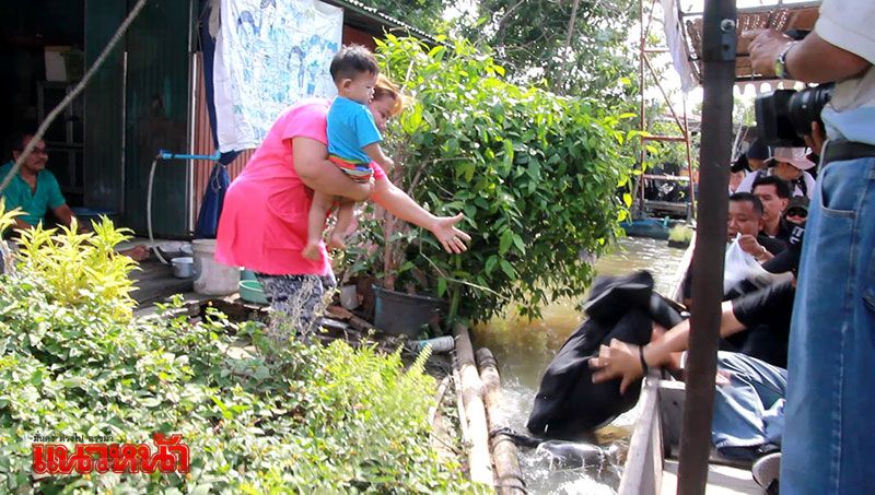 ขณะที่เรือคณะของดร.มนัส โนนุช กรรมการและผู้อำนวยการสำนักนโยบายและแผน มูลนิธิมิราเคิลออฟไลฟ์ ซึ่งมีถั่วแร่ะ เชิญยิ้ม นายกสมาคมตลกแห่งประเทศไทย ร่วมขบวนแจกของให้กับชาวบ้านที่ประสบภัยบ้านแถว ต.เจ้าเจ็ดใน ขณะกำลังเอาเรือเทียบเพื่อมอบสิ่งของช่วยเหลือน้ำท่วม ถั่วแร่ะ ได้ยื่นมือเพื่อจับมือของผู้ประสบภัยที่เป็นผู้หญิงคนหนึ่งซึ่งกำลังอุ้มลูกมารับของแจกอยู่นั้น ได้เกิดพลาดท่าเสียหลักหลุดร่วงหัวทิ่มลงไปในน้ำ โชคดีที่คนบนเรือช่วยกันจับตัวไว้ได้ จึงไม่หล่นลงไปในน้ำทั้งตัว แต่ศีรษะและลำตัวจุ่มลงไปในน้ำครึ่งตัว ทำให้เพื่อนร่วมคณะถึงกลับฮากลิ้ง แต่เจ้าตัวขำไม่ออกเพราะสำลักน้ำ สำหรับเส้นทางที่ล่องเรือไปแจกของเพื่อเยียวยาให้กำลังใจผู้ประสบภัยน้ำท่วม ต่างเจออุปสรรคต่างๆนาๆ โดยต้องแล่นเรือฝ่ากองผักตบชวากองมหึมาที่ลอยอยู่เต็มคลอง และสายไฟ สายเคเบิ้ลของชาวบ้านที่พาดผ่านระหว่างคลองห้อยระโยงระยาง ต้องระมัดระวังตลอดเส้นทาง จนไปสุดปลายทางขึ้นเรือที่ท่าหน้าอำเภอบางซ้ายโดยมีนายอำเภอบางซ้าย และ พ.ต.อ.ศราวุธ สวัสดิชัย ผกก.สภ.บางซ้าย และเจ้าหน้าที่ ทหาร มาคอยต้อนรับคณะแจกของอย่างอบอุ่น