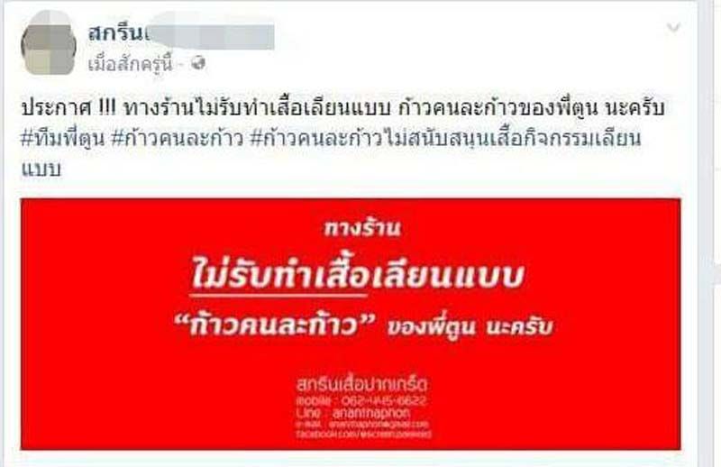 และนี่คือ ผู้ประกอบการผลิตเสื้อทั้งรายเล็ก กลาง ใหญ่ ได้ออกมาประกาศจุดยืน ไม่ผลิตและไม่อุดหนุนสินค้า ก้าวคนละก้าวของปลอม และถ้าใครพบเห็นแหล่งจำหน่ายเสื้อก้าวปลอม แจ้งมาได้เลยทางเราจะรวบรวมให้หน่วยงานเข้าไปดูแลให้ #กรมทรัพย์สินทางปัญญา”