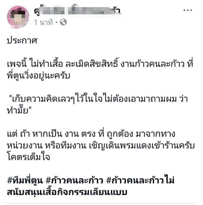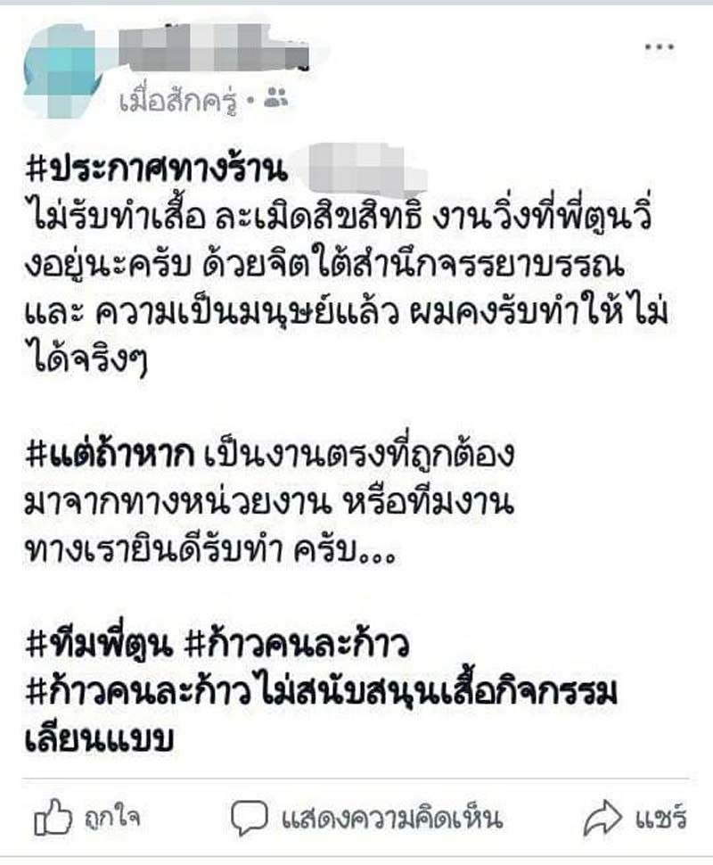 “เมื่อวานนี้ มีลูกเพจท่านหนึ่งเป็นเจ้าของโรงสกรีนเสื้อ โทรมาปรึกษาบอกว่าร้านในเครือได้รับการติดต่อให้ทำเสื้อ “ก้าวคนละก้าว” โดยไม่มีไฟล์ มาแต่โลโก้ เอกสารอะไรก็ไม่มี ทางเฮียไม่รับทำ แต่เพื่อนแจ้งมาว่าวันนี้ลูกน้องเดินไปเจอขายในตลาดโบ๊เบ๊ตัวละ 200 ซึ่งเฮียรู้สึกแย่ ประเด็นคือปล่อยให้เป็นแบบนี้ไม่ได้ เราจะทําอะไรเพื่อไม่ให้พวกก๊อปเสื้อหาผลประโยชน์จากพี่ตูน เพราะ 1.มันเป็นการปลูกจิตสำนึกของคนซื้อ 2.มันคือจิตสํานึกของพ่อค้าเสื้อผ้าอย่างเรา 3.เห็นใจพี่ตูน แกเสียสละเยอะแล้ว อย่างน้อยก็อยากให้มันได้เต็มเม็ดเต็มหน่วยอย่างที่แกตั้งใจ และ4.การที่มิจฉาชีพได้ผลประโยชน์ได้เงิน จากกิจกรรมการกุศลเป็นสิ่งที่ไม่โอเค