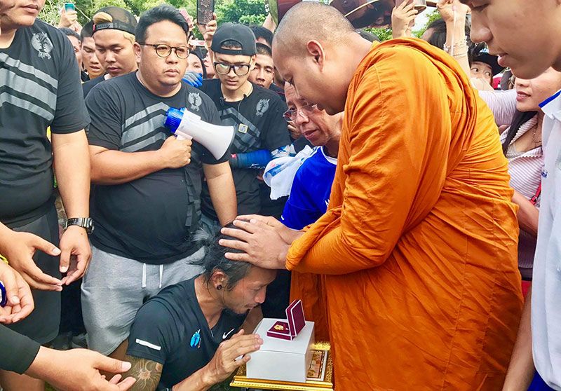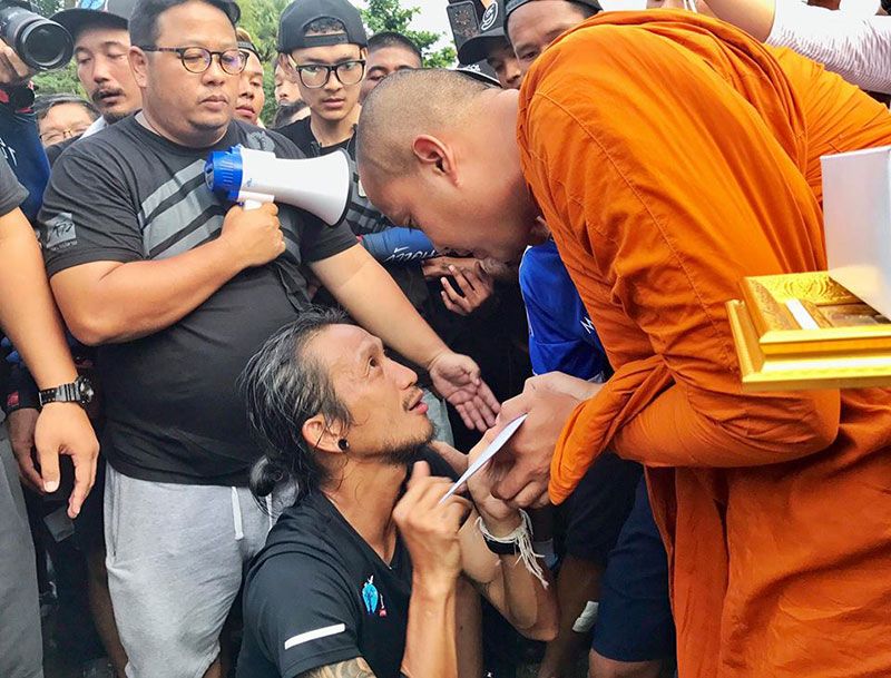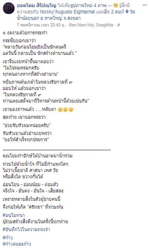 ซึ่งผู้โพสต์ข้อความระบุว่า งดงามด้วยการกระทำ กระซิบบอกเขาว่า “หลายวันก่อนโยมยังเป็นนักดนตรี แต่วันนี้ กลายเป็น นักสร้างตำนานแล้ว” เขารีบเงยหน้าขึ้นมาตอบว่า “ไม่ใช่ผมหรอกครับ ทุกคนต่างหากที่สร้างตำนาน” หยิบภาพล้นเกล้าในหลวงรัชกาลที่ 9 มอบให้ แล้วบอกเขาว่า “ในหลวงรัชกาลที่ 9 ท่านเคยเสด็จมาที่วิหารด้านหน้านี้ด้วยเช่นกัน” เขามองภาพแล้ว…..หลับตา สุดท้าย เขาบอกพระว่า “ช่วยจับหัวผมหน่อยครับ” จับหัวเขาแล้วอำนวยพรว่า “ขอให้สำเร็จทุกประการ”