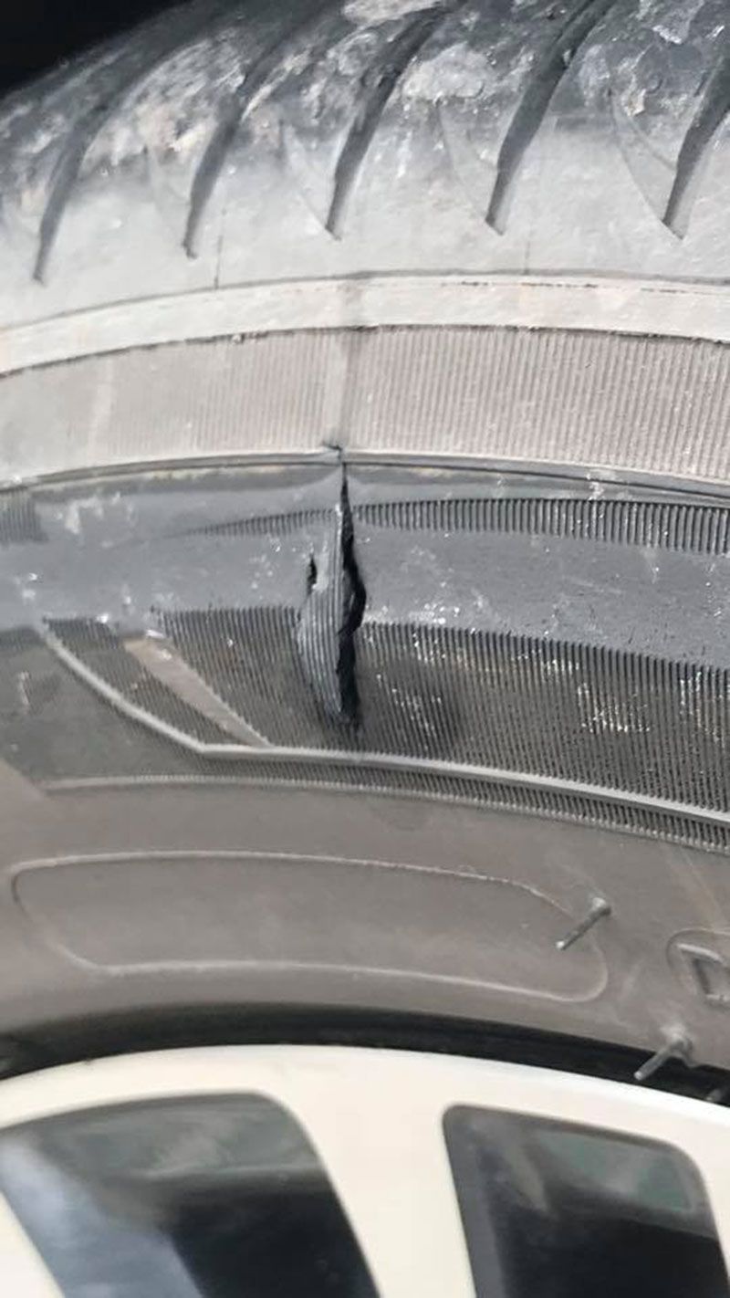 แต่เมื่อเจ้าของรถเดินผ่านมาอีกร้าน ห่างกันแค่ 15 ก้าว ขายพวงมาลัยแบบเดียวกัน 50 บาท ธูปชุดละ 20 บาท น้ำมันขวดละ 15 บาท หากรวมกันราคาแค่ 240 บาท แต่ก็ไม่ได้คิดอะไร จนไปไหว้พระและกลับมาที่รถ ก่อนขับออกไปประมาน 10โล ก็สังเกตุได้ว่ารถมันแปลกๆ มีเสียงเหมือนบดอะไรอยู่ เราก็ค่อยๆๆชะลอ จึงจอดรถดูพบยางรถมีรอยกรีดชัดๆ ซึ่งดูแล้วเป็นรอยกรีด 10 เปอร์เซ็นต์ สักพักผมก็โทรหาร้านยางตรงหนองปลาตะเพียน เพื่อขอความช่วยเหลือ ไม่เกิน 15นาที ก็มาเปลี่ยนยางอะไหล่ไห้ผม ทางร้านก็ช่วยดูรอยนี้มันคือรอยกรีด 100% แล้วทางร้านยังบอกอีก ทีลานจอดประจำ เดียวรถหาย โดนขูด ขายของแพง ชัดเลย แบบนี้