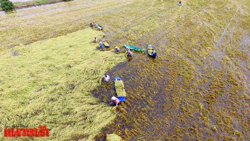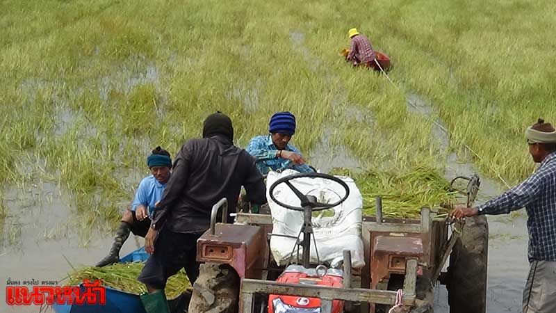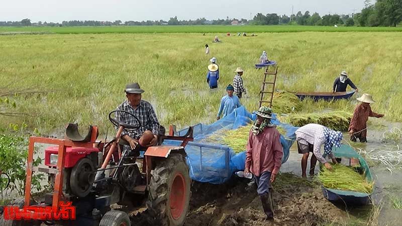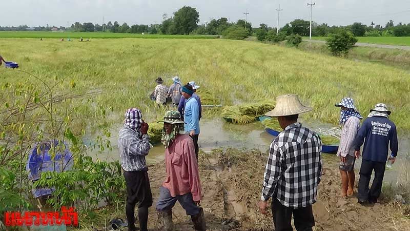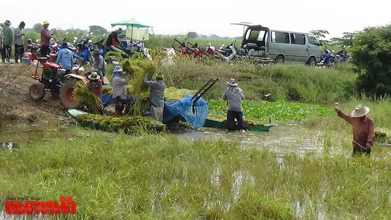 ชาวอ่างทองฮุยเลฮุย ลงแขกเกี่ยวข้าวกลางน้ำท่วม (ประมวลภาพ)