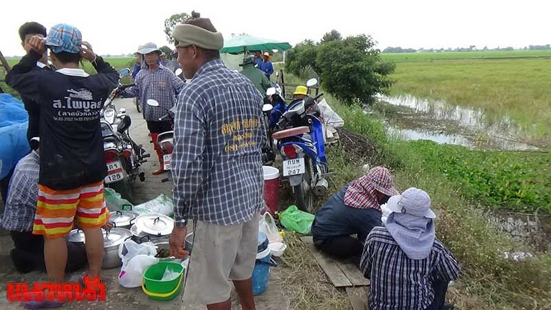 19 พ.ย.60 ผู้สื่อข่าวรายงานบรรยากาศของชาวนากว่า 50 คน ร่วมแรงร่วมใจลงแขกเกี่ยวข้าวกลางน้ำ ที่กลางทุ่งนาหมู่ 2 ตำบลตลาดใหม่ อำเภอวิเศษชัยชาญ จังหวัดอ่างทอง หลังระดับน้ำลดลงไม่ทันเกี่ยวข้าวในนาของนายสำเริง จูจวง อายุ 54 ปี จำนวน 8 ไร่ ที่กำลังสุกงอมอยู่กลางนา ที่มีน้ำท่วมขังสูงกว่า 1 เมตร ซึ่งในการจ้างแรงงานคนเก็บเกี่ยวนำผลผลิตไปขายคงไม่คุ้มต้นทุน ทางกำนันผู้ใหญ่บ้าน ตำบลตลาดใหม่ จึงได้ร่วมกันลงแขกเกี่ยวข้าวตามวัฒนธรรมสมัยโบราณ ในการช่วยกันเก็บเกี่ยวผลผลิตในนาข้าวช่วยเหลือเพื่อนชาวนา ที่นำข้าวปลาอาหารมาเลี้ยงกันอย่างอิ่มหนำสำราญ ร่วมพลังกันลุยน้ำลงแขกเกี่ยวข้าวที่หาพบได้ในบริเวณทุ่งนา ตำบลตลาดใหม่