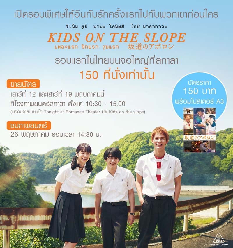 มงคล ซีนีม่า เอาใจแฟนคลับ นานะ โคมัตสึ , จิเน็น ยูริ , ไทชิ นาคากาวะ ให้อินไปกับรักครั้งแรกที่ลืมไม่ลง ที่โรงภาพยนตร์สกาลา ไปกับหนัง KIDS ON THE SLOPE เพลงแรก รักแรก จูบแรก ในวันที่ 26 พฤษภาคม เวลา 14.30 น. บัตรล่วงหน้าราคาเพียง 150 บาท (พร้อมรับโปสเตอร์ลิมิตเตด ฉบับญี่ปุ่น ไซส์ A3) โดยมีกำหนด เปิดจำหน่ายบัตร 19 พฤษภาคม ที่โรงภาพยนตร์สกาลา ตั้งแต่ 10.30– 15:00 น. โดยภายในงานมีการจำหน่าย T-shirt ลิขสิทธ์จากภาพยนตร์อีกด้วย