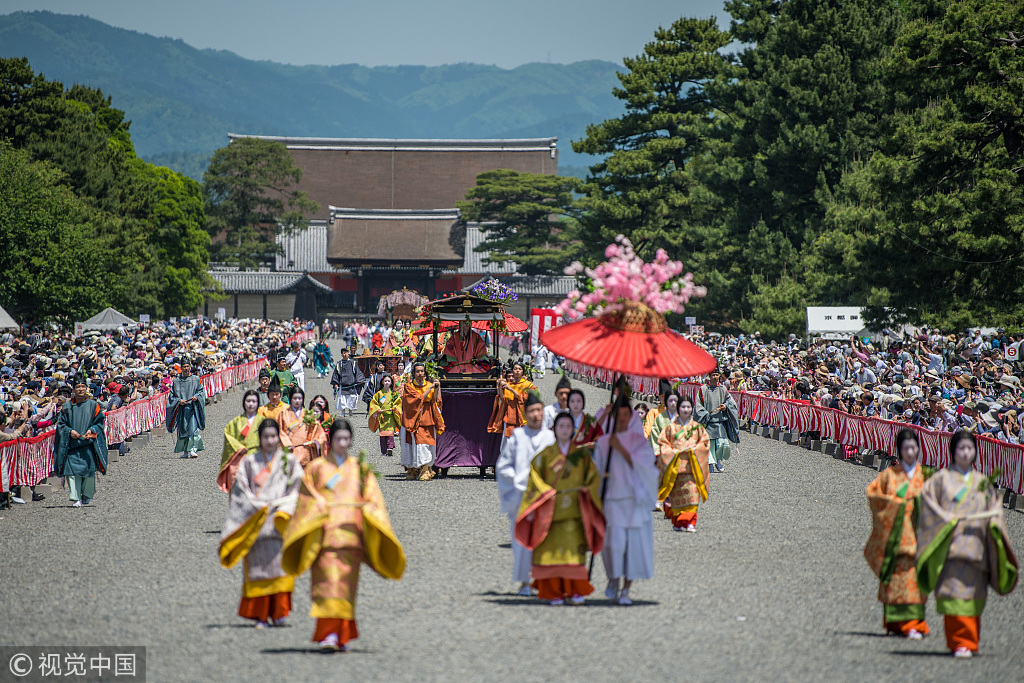 Participants in Heian period dress parade through the grounds of Kyoto Imperial Palace during the Aoi Festival on May 15, 2018 in Kyoto, Japan. [Photo/VCG]