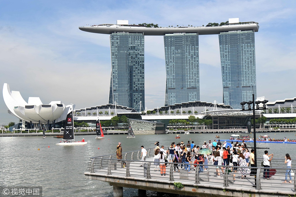 This photograph taken on May 27, 2018 shows people viewing the Marina Bay Sands hotel and resort from the Merlion Park in Singapore. [Photo/VCG]