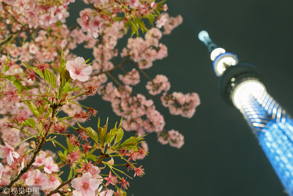 Kawazu-zakura cherry blossoms in bloom with Tokyo Skytree behind on Feb 22, 2017, in Tokyo, Japan. [Photo/VCG]