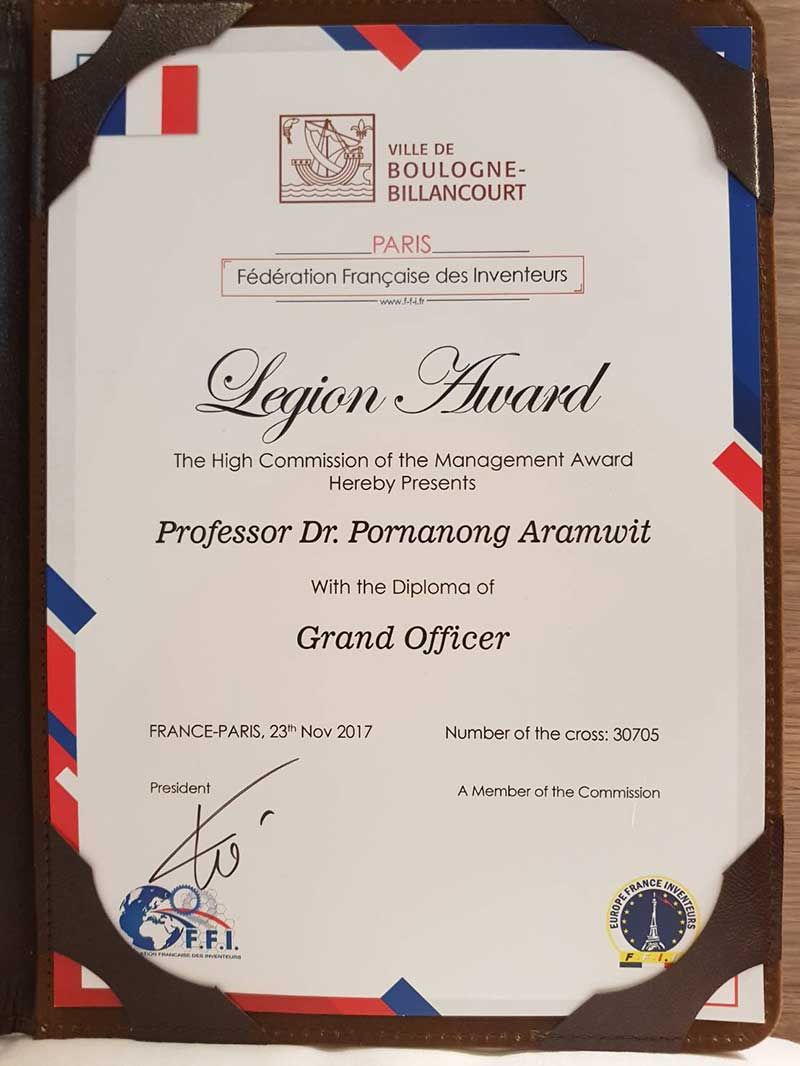 เมื่อวันที่ 23 พฤศจิกายน ที่ผ่านมา ณ ศูนย์ประชุม Ville de Boulogne-Billancourt กรุงปารีส ประเทศฝรั่งเศส ศาสตราจารย์ เภสัชกรหญิง ดร.พรอนงค์ อร่ามวิทย์ แห่งคณะเภสัชศาสตร์ จุฬาลงกรณ์มหาวิทยาลัย ได้รับรางวัลเชิดชูเกียรติ ขั้น Grand Officer หรือชั้นอัศวิน ซึ่งเป็นรางวัลชั้นสูงสุด จากสมาพันธ์นักประดิษฐ์แห่งฝรั่งเศส (Federation Francaise des Inventeurs)