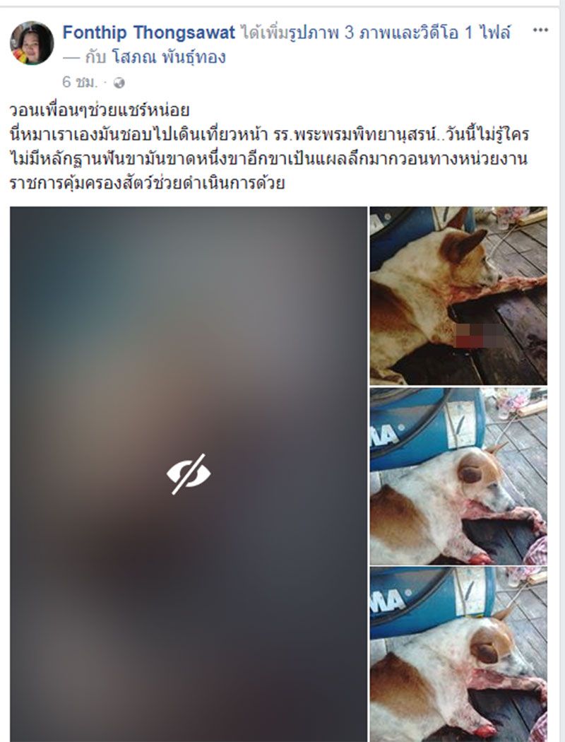27 พ.ย.60 ผู้สื่อข่าวรายงานว่า โลกโซเชียล “Fonthip Thongsawat” ได้มีการเผยแพร่คลิปและภาพสุนัขตัวหนึ่งที่ถูกคนใจร้าย ใช้ของมีคมฟันที่ขาหน้าด้านขวาจนขาดเป็นแผลฉกรรจ์ เลือดไหลนองพื้นเป็นที่น่าเวทนาสงสาร พร้อมโพสต์ข้อความว่า “วอนเพื่อน ๆ ช่วยแชร์หน่อย นี่หมาเราเอง มันชอบไปเดินเที่ยวหน้า รร.พระพรมพิทยานุสรน์ วันนี้ไม่รู้ใคร ไม่มีหลักฐานฟันขามันขาดหนึ่งขาอีกขาเป็นแผลลึกมากวอนทางหน่วยงานราชการคุ้มครองสัตว์ช่วยดำเนินการด้วย”