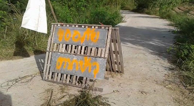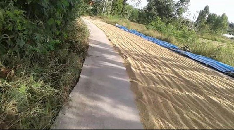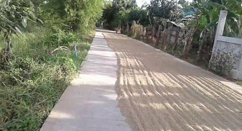 ได้เหรอ!ปิดถนนตากข้าว ติดป้ายทางเข้า-ออกไม่ให้รถผ่าน