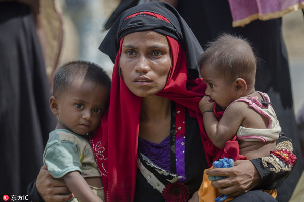 File photo: In this Sunday, Oct. 22, 2017 file photo, Rohingya woman, Rukaya Begum, who crossed over from Myanmar into Bangladesh, holds her son Mahbubur Rehman, left and her daughter Rehana Bibi, after the government moved them to newly allocated refugee camp areas, near Kutupalong, Bangladesh. [Photo/IC]