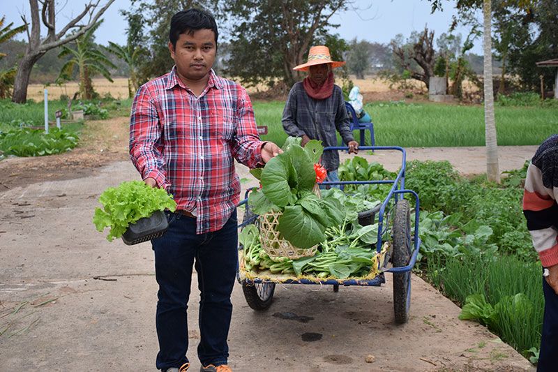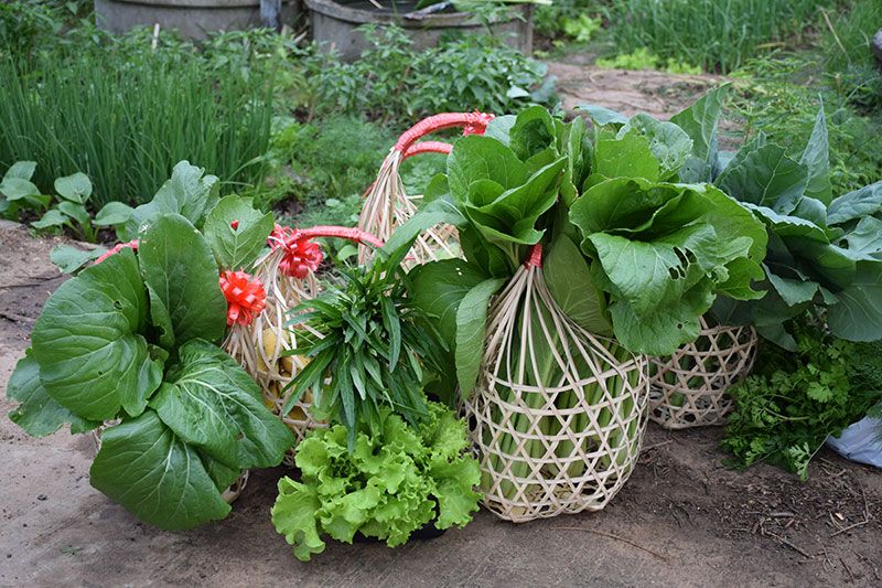 ส่วนผักที่ใส่กระเช้าปีใหม่ มาจากกลุ่มปลูกผักอินทรีย์ปลอดสารพิษบ้านอาทึก ตามโครงการส่งเสริมเศรษฐกิจพอเพียง ที่ส่วนราชการได้ส่งเสริมเสริมให้ปลูกผักต่างๆ อาทิเช่น สลัด คะน้า ผักกาดขาว ผักกาดเขียว พริก กวางตุ้ง มะเขือ หอม กระเทียม ข้าวโพด มะเขือเทศ และกล้วย โดยจะมีการแบ่งแปลงผักเป็นสัดส่วนคนละเท่าๆกัน ตามบ้านเลขที่ ซึ่งจะมีป้ายชื่อเจ้าของแปลงผักติดอยู่ แต่ละแปลงจะมีบ่อซีเมนต์ไว้ให้ตักน้ำรดผักเอง เพื่อส่งเสริมการออกกำลังกายอีกทาง ตอนเย็นหลังจากรดน้ำต้นไม้เสร็จแล้ว ก็จะมีกิจกรรมร่วมกันเพื่อส่งเสริมให้คนในชุมชน มีส่วนร่วมและกินผักที่ดีมีประโยชน์และปลอดสารพิษ