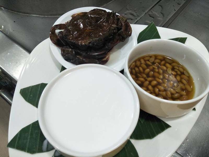 อีกเมนูหนึ่งที่แม่ครัวโชว์ให้ดู และเป็นเมนูที่ลูกค้าสั่งมากไม่แพ้ “ปูนิ่มหลน” คือ “ไก่ห่อใบเตย” เมนูนี้ดูจะมีเสน่ห์ตรงความหอมของเป็นเตย และความแปลกตานั้นเอง ส่วนผสมของเมนูนี้ ก็จะเป็นไก่เนื้อหั่นพอคำหมักด้วย ซอสปรุงรส กระเทียม ผงกระหรี่ รากผักชี นาน 1 คืน เพื่อให้ได้รสชาติเข้มข้น จากนั้นก็นำมาห่อกับใบเตย …ใช้ใบเตยสดเพียงใบเดียวห่อไก่ที่หมักไว้ แล้วนำไปทอดในน้ำมัน ให้ท่วมไก่เพื่อให้สุกทั่วถึง จากนั้นก็ยกเสิร์ฟรับประทานคู่กับน้ำจิ้มไก่ เพิ่มรสชาติหวานจากน้ำจิ้ม อร่อยไปอีกแบบ