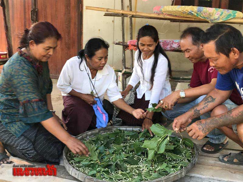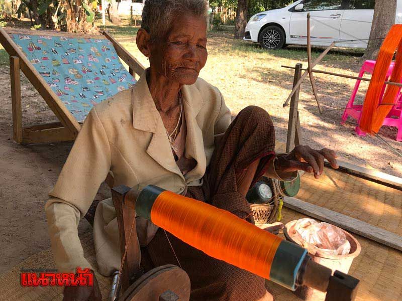 จุดแรก คือ การไปพบกับ “สมาชิกอาวุโส” ของกลุ่มฯ คือ “คุณยายอุม ยืนยาว” อายุ 82 ปี ซึ่งขณะที่ผู้สื่อข่าวไปถึง คุณยายกำลังนำเส้นไหมขั้นหนึ่งหรือ “ไหมน้อย” หรือภาษาเขมรเรียกว่า “โซกซัก” มาใช้ในการทอผ้า “ไหมน้อย” จะมีลักษณะเป็นผ้าไหมเส้น “เล็ก เรียบ นิ่ม” เวลาสวมใส่จะรู้สึกเย็นสบาย