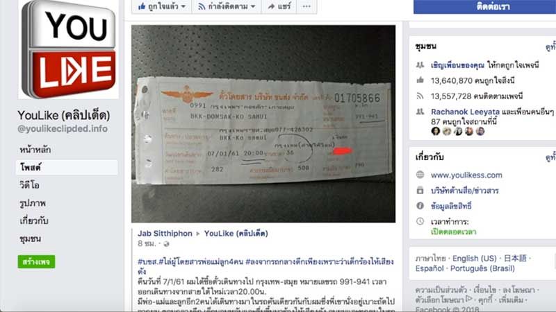 9 ม.ค.61 เมื่อวันที่ 8 ม.ค.61 มีรายงานว่าผู้ใช้เฟซบุ๊กชื่อว่า Jab Sitthiphon ได้โพสต์ข้อความลงในเพจดัง YouLike (คลิปเด็ด) ถึงเหตุการณ์ที่รถโดยสารปรับอากาศ บขส.ไล่ผู้โดยสารพ่อแม่ลูก รวม 4คน ลงจากรถกลางดึกหน้าปั๋มน้ำมั่นแห่งหนึ่งในพื้นที่อ.ชะอำ จ.เพชรบุรี เพียงเพราะว่าเด็กร้องไห้เสียงดัง