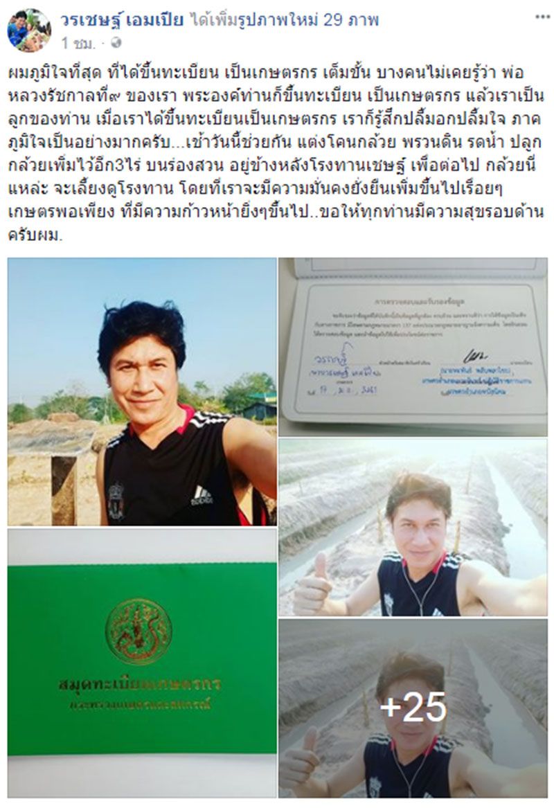 18 ม.ค. 61 นายวรเชษฐ์ เอมเปีย หรือ เชษฐ์ สไมล์บัฟฟาโล่ ศิลปินชื่อดัง ได้โพสต์เฟซบุ๊ก“วรเชษฐ์ เอมเปีย” ระบุว่า ผมภูมิใจที่สุด ที่ได้ขึ้นทะเบียน เป็นเกษตรกร เต็มขั้น บางคนไม่เคยรู้ว่า พ่อหลวงรัชกาลที่ ๙ ของเรา พระองค์ท่านก็ขึ้นทะเบียน เป็นเกษตรกร แล้วเราเป็นลูกของท่าน เมื่อเราได้ขึ้นทะเบียนเป็นเกษตรกร เราก็รู้สึกปลื้มอกปลื้มใจ ภาคภูมิใจเป็นอย่างมากครับ…