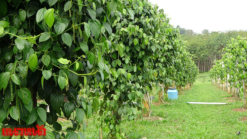 สวนพริกไทย พันธุ์ซีลอน เป็นพันธุ์ที่นำมาจากสุโขทัยเพื่อมาปลูกในพื้นที่ 1 ไร่เศษ จำนวน 300 ต้น/เสา อายุของพริกไทย 2 ปี เริ่มให้ผลผลิตมากขึ้นทุกปี เพียงดูแลใส่ใจเรื่องน้ำไม่มากหรือน้อยเกินไปแต่งให้ตัวต้นโปร่งแสงเฝ้าดูแลเรื่องโรคเชื้อราและบำรุงดินด้วยปุ๋ยหมัก