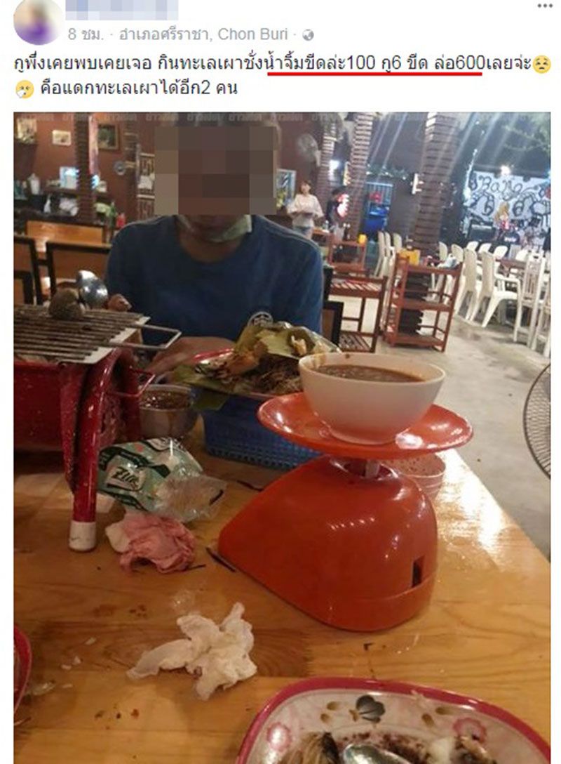 “เพิ่งเคยพบเคยเจอ กินทะเลเผาชั่งน้ำจิ้มขีดละ 100 กู 6 ขีด ล่อ 600 เลยจ้ะ คือกินทะเลเผาได้อีก 2 คน”