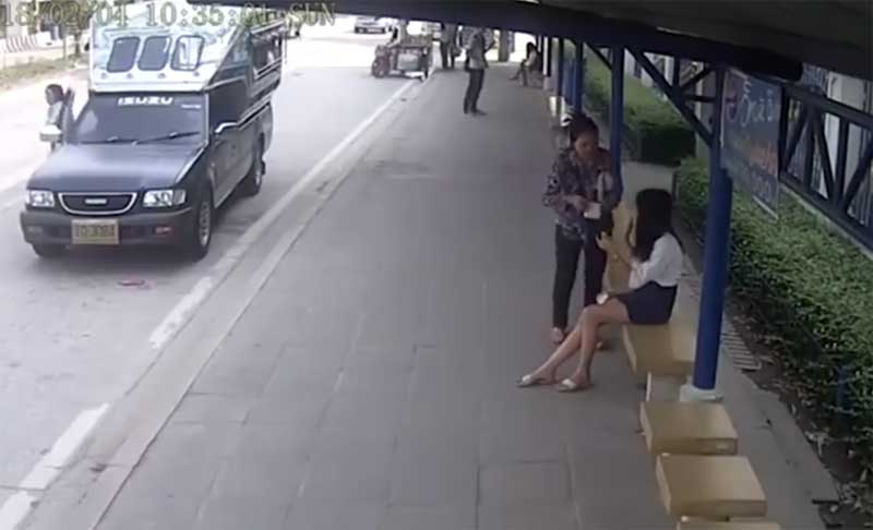 ภาพจากกล้องวงจรปิดบันทึกเหตุการณ์ไว้เมื่อวันที่ 4 ก.พ.ที่ผ่านมา ขณะรถบัสโดยสารสาย พานทอง-ชลบุรี กำลังจอด ซึ่งมีคนลงจากรถบันไดหน้าและมีคนวิ่งมาขึ้นรถทางบันไดหลัง ช่วงที่กำลังออกตัวได้มีหญิงสาวคนหนึ่งก้าวลงจากบันไดหลังแล้วตกลงมาจากรถ ส่งผลให้ใบหน้าและคางกระแทกกับพื้นได้รับบาดเจ็บ จึงได้เดินมาพักที่บริเวณที่พักรถโดยสาร โดยมีรถสองแถวเห็นเหตุการณ์จึงได้มาช่วยเหลือนำส่งโรงพยาบาลเพื่อรักษาตัว