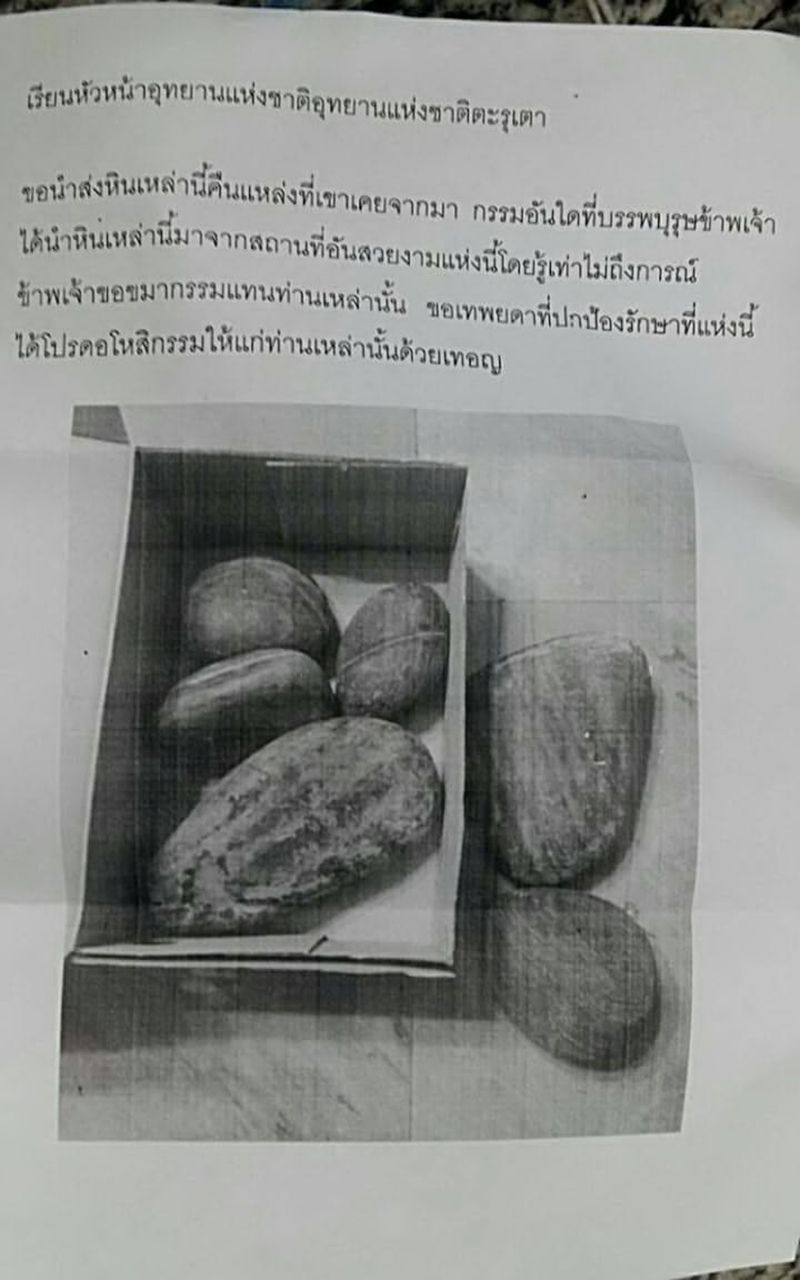 นายจินดา ศรีสุพพัตพงษ์ นักวิชาการป่าไม้ชำนาญการ ผู้ช่วยหัวหน้าอุทยานแห่งชาติตะรุเตา กล่าวว่า การจัดส่งพัสดุเพื่อส่งคืนหิน จากเกาะหินงามในหมู่เกาะอุทยานแห่งชาติตะรุเตา ในแต่ละปี มีมาก 20-30 ก้อน บ้างส่งมาจาก กทม. ต่างจังหวัด และต่างประเทศก็เคยมี เคยมีส่งมาเยอะสุด 6 ก้อนเต็มกล่อง พร้อมถ้อยคำขอขมาลาโทษที่ล่วงเกิน ซึ่งเชื่อว่าอาจเป็นผลจากสิ่งที่นักท่องเที่ยวหยิบไปและประสบพบเจอสิ่งที่ไม่คาดฝัน และชีวิตเจออุปสรรค ประกอบด้วยกลัวความผิดจึงเลือกส่งกลับมาในรูปแบบนี้ บางคนลงทุนบินมาเพื่อนำหินกลับมายังเกาะเพื่อขอขมาด้วยตัวเองก็เคยมี