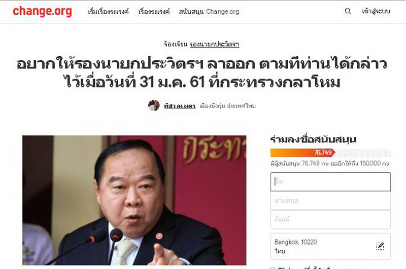 8 ก.พ. 2561 จากกรณีเว็บไซต์ konrakpa.org หรือ “คนรักษ์ป่า” ได้มีการเปิดแคมเปญให้ลงชื่อสนับสนุน พล.อ.ประวิตร วงษ์สุวรรณ รองนายกฯ และ รมว.กลาโหม ให้อยู่ในตำแหน่งต่อไป มีจำนวนผู้โหวต แซงหน้าหัวข้อรณรงค์ที่นางทิชา ณ นคร ผู้อำนวยการศูนย์ฝึกและอบรมเด็กและเยาวชนชายบ้านกาญจนาภิเษก ตั้งไว้บนเว็บไซต์ change.org เรียกร้องให้ พล.อ.ประวิตร ลาออกจากคณะรัฐมนตรี (ครม.) นั้น