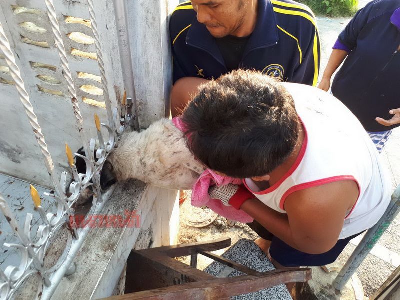 ‘เจ้าโค้ก’หมาจอมซ่า มุดรั้วบ้านคู่อริ หัวติดแหง็กดึงไม่ออก ร้อนถึงพี่กู้ภัยต้องมาช่วย