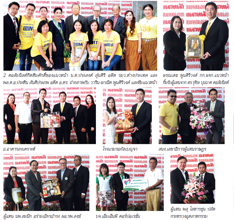 2 คอลัมนิสต์กิตติมศักดิ์ของแนวหน้า น.ต.ประสงค์ สุ่นศิริ อดีต รมว.ต่างประเทศ และ พล.ต.อ. ประทิน สันติประภพ อดีต อ.ตร. ถ่ายภาพกับ วาริน-ผาณิต พูนศิริวงศ์ และทีมแนวหน้า