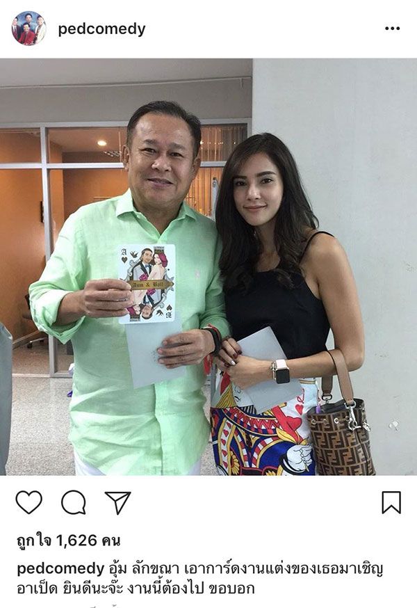 ล่าสุด ตลกอาวุโสอย่าง เป็ด เชิญยิ้ม ได้โพสต์ภาพขณะดาราสาว อุ้ม ลักขณา นำการ์ดแต่งงานมาเชิญไปร่วมงาน โดย เป็ด เชิญยิ้ม เผยแคปชั่นว่า “อุ้ม ลักขณา เอาการ์ดงานแต่งของเธอมาเชิญอาเป็ด ยินดีนะจ๊ะ งานนี้ต้องไป ขอบอก” แต่จะเป็นวันไหนคงต้องรอให้ทั้งคู่มาบอกด้วยตัวเอง
