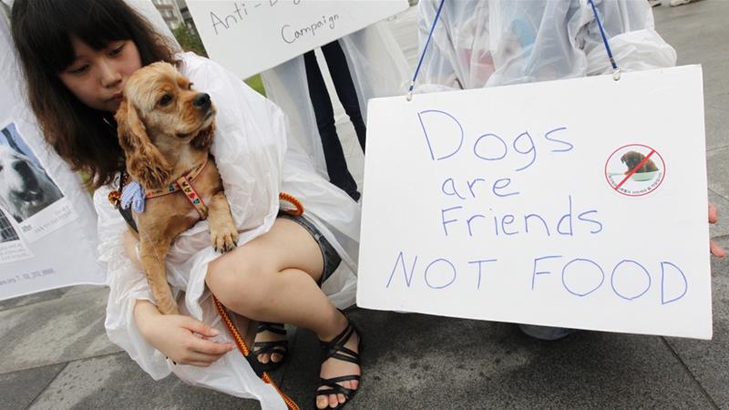 หญิงสาวอุ้มสุนัขและป้ายรณรงค์ “สุนัขเป็นเพื่อนไม่ใช่อาหาร” ในเกาหลีใต้
