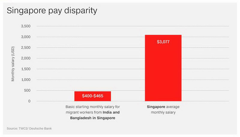 รายงานของ CNN กล่าวว่า แรงงานข้ามชาติในสิงคโปร์ทำงานโดยไม่มีการกำหนดค่าแรงขั้นต่ำ นั่นทำให้พวกเขาได้ค่าจ้างน้อยมากเมื่อเทียบกับพนักงานออฟฟิศ อาทิ Sardar Md Insan Aliชาวบังกลาเทศที่ตัดสินใจทิ้งบ้านเกิดมาแสวงหาโอกาสในสิงคโปร์เมื่อปี 2560 ด้วยคำโฆษณาว่าหากเขามาทำงานก่อสร้างที่นี่ เขาจะได้ค่าจ้าง 1,173 เหรียญสหรัฐ หรือราว 3.7 หมื่นบาทต่อเดือน หรือ 1.2 พันบาทต่อวัน แต่เมื่อมาจริงกลับพบว่า เขาได้รับค่าจ้างเพียง 13 เหรียญสหรัฐ หรือราว 4 ร้อยบาทเศษต่อวันเท่านั้น
