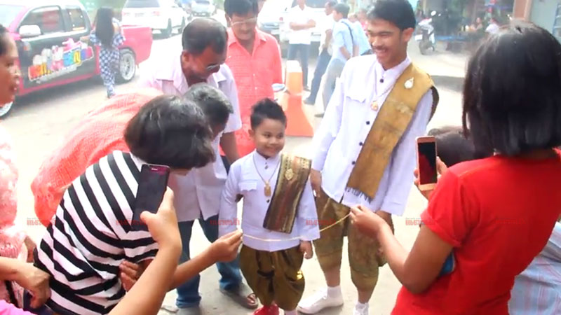 บรรยากาศในช่วงเช้ามีการจัดขบวนแห่ขันหมาก รำกลองยาว มาจาก ที่บ้านเลขที่ 4 ม.5 ต.ปลายพระยา บ้านของทั้งคู่ ไปยังบ้านเลขที่ 49 ถนนบางแก้วใต้ ซึ่งเป็นบ้าน ของนางพิณ สุวรรณโชติ อายุ92ปี ทวดของคู่บ่าวสาว บรรยากาศเป็นไปอย่างคึกคัก ท่ามกลางความประหลาดใจของชาวบ้านที่พบเห็น ต่างหยิบโทรศัพท์มาถ่ายรูปไว้ที่ระลึก และวิพากษ์วิจารณ์กันไปต่างๆนานา เนื่องจากไม่เคยมีบ้านไหน จัดพิธีแต่งงานให้กับเด็กอายุ น้อยขนาดนี้มาก่อน เมื่อขบวนขันหมากมาถึงทีบ้านเลขที่49 ซึ่งเป็น สถานทีจัดงานก็มีการตั้งด่าน กั้นเจ้าบ่าวก่อนถึงห้องหอ ซึ่งเจ้าบ่าวจะต้องแจกซองให้ จึงจะผ่านแต่ละด่านไปได้ จากนั้นก็เข้าไปในบ้านทำพิธี สวมสร้อยคอ เจ้าบ่าวเจ้าสาว และให้เจ้าบ่าวหอมแก้มเจ้าสาว โดยมีเงินค่าสินสอดคร้งนี้ จำนวน 1แสนบาท นอกจากนั้นมีการทำพิธีรับพรจากพระ เพื่อความสิริมงคล ซึ่งทุกอย่างทำตามพิธีแต่งงานของผู้ใหญ่ทุกประการ ท่ามกลางญาติพี่น้องมาร่วมพิธีจำนวนมาก