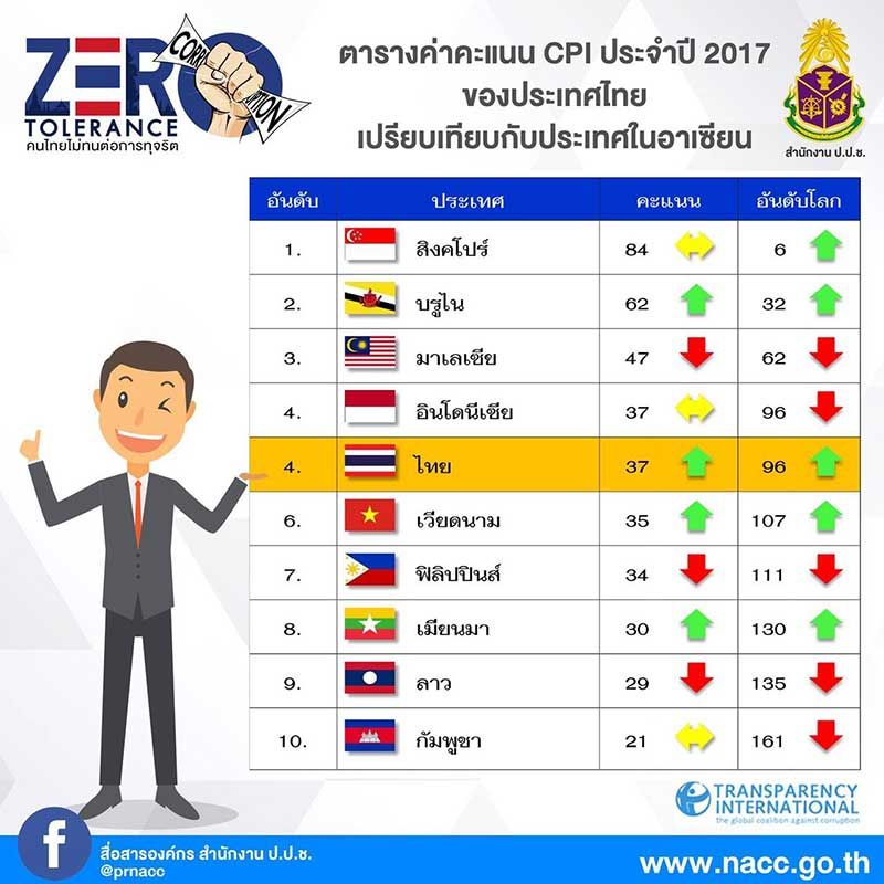 22ก.พ.61 ผู้สื่อข่าวรายงานว่า องค์กรเพื่อความโปร่งใสนานาชาติ (Transparency International : IT) เปิดเผยคะแนนดัชนีการรับรู้การทุจริต (CPI) ประจำปี 2560 ปรากฎว่าประเทศไทย ได้ 37 คะแนน อยู่ในอันดับ 96 จากทั้งหมด 180 ประเทศ ร่วมกับ ประเทศบราซิล โคลัมเบีย อินโดนีเซีย ปานามา เปรู และแซมเบีย