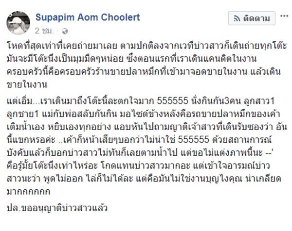 28 ก.พ. 61ผู้ใช้เฟซบุ๊กชื่อ “Supapim Aom Choolert” ได้แชร์ประสบการณ์เป็นเรื่องของคนที่ทำเนียนเข้าไปร่วมงานเเต่งงาน โดยที่เจ้าของงานไม่ได้รู้จักและไม่ได้เชิญ