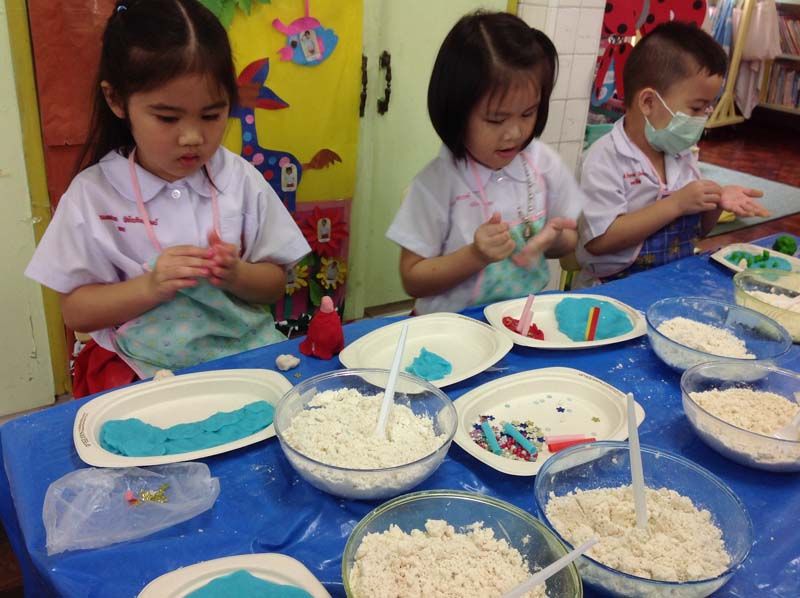 สัปดาห์ต่อมา เด็กๆ ได้เริ่มสืบค้นหาคำตอบสิ่งที่สงสัยเกี่ยวกับแป้งสาลี ผ่านกิจกรรมการใช้ประสาทสัมผัสในการสำรวจ ดมกลิ่น และชิมรสชาติของแป้งสาลีได้สืบค้นว่า กว่าจะมาเป็นแป้งสาลีนั้น มีขั้นตอนอย่างไรบ้างและแหล่งที่มาของแป้งสาลีมาจากที่ใด โดยสืบค้นผ่านอินเตอร์เนต ยูทูบ จนได้ข้อสรุปว่า แป้งสาลี คือแป้งที่ได้จากเมล็ดข้าวสาลี เอาไปบดให้เป็นผง ใช้ทำขนมได้ สัปดาห์ถัดไป ได้รับความรู้เรื่องแป้งสาลีโดยคุณป้ายุ-ยุวดี ใจหาญ จากบริษัทอุตสาหกรรมแป้งข้าวสาลีไทย จำกัด มาให้ความรู้เพื่อตอบข้อสงสัยที่ว่า กว่าจะเป็นแป้งสาลี มันได้มาจากที่ไหน โดยป้ายุได้เล่าถึงการปลูกข้าวสาลีในประเทศไทยว่ามีการปลูกอย่างไร และยังนำต้นข้าวสาลี,รวงข้าวสาลีมาให้เด็กๆ สำรวจ สัมผัส และเล่าถึงขั้นตอนในการผลิตแป้งสาลีว่ามีขั้นตอนอย่างไรบ้าง นำภาพการทำงานของเครื่องจักรไฟฟ้า ในขั้นตอนต่างๆ มาให้ดูประกอบ นำแป้งสาลีชนิดต่างๆ แป้งสาลีอเนกประสงค์, แป้งขนมปัง, แป้งเค้ก มาให้สำรวจกัน สร้างความสนใจให้กับทุกคนเป็นอย่างมาก นอกจากนี้ เด็กๆ ยังได้ทดลองทำแป้งโดว์ โดยใช้วิธีในการค้นหาข้อมูลถึงสูตรและวิธีการทำ รวมถึงส่วนผสมและอุปกรณ์ เด็กทุกคนได้ตวงส่วนผสมด้วยตัวเอง ทำให้พวกเขาได้เกิดการทดลองทำ ลองผิดลองถูกและสังเกตลักษณะของแป้งว่าเป็นอย่างไร ได้เรียนรู้ถึงวิธีการแก้ปัญหาจนสำเร็จ ทำให้เด็กๆ สามารถทำให้แป้งสาลีที่เป็นผง กลายเป็นก้อนแป้งโดว์ได้ตามที่ต้องการ การเรียนรู้ลำดับถัดไป เด็กๆ ได้รู้สีจากธรรมชาติที่นำมาผสมกับแป้งโดว์เพื่อทำให้มีสีสันมากขึ้น ใช้วัตถุดิบจากธรรมชาติเพื่อให้ได้สีที่ต้องการ เช่น สีน้ำเงิน ได้จากสีของดอกอัญชัน,สีเหลือง ได้จากสีของดอกดาวเรือง เป็นต้น
