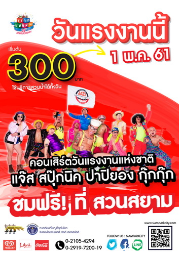 สยามพาร์คซิตี้ สวนสยาม ร่วมฉลองวันแรงงานแห่งชาติ ซึ่งตรงกับวันอังคารที่ 1 พฤษภาคม 2561 โดยมีวัตถุประสงค์เพื่อส่งเสริมและสนับสนุนให้ทุกฝ่ายได้ตระหนักถึงคุณค่าและความสำคัญของผู้ใช้แรงงานที่ได้ร่วมกัน สร้างสรรค์ และทำประโยชน์แก่เศรษฐกิจของประเทศมาโดยตลอด จึงได้จัดให้มีการแสดงฟรีคอนเสิร์ต แจ๊ส ชวนชื่นและสมาชิกวง สปุ๊กนิค ปาปิยอง กุ๊กกุ๊ก ซึ่งมีผลงานซิงเกิ้ลล่าสุด “Stressed Out” พร้อมโชว์เพลงใหม่และเพลงฮิต ในระบบแสง สี เสียงตระการตา พร้อมแดนเซอร์ สมบูรณ์แบบคับคั่งเวที มอบดนตรีที่มีทั้งความสนุกและฮา พิเศษในวันแรงงาน 1 ชั่วโมงเต็มณ เวทีบาร์ซาร์ สวนสยาม