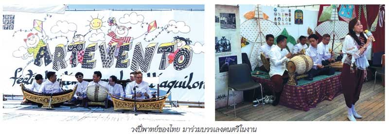 บรรยากาศภายในงานคึกคักไปด้วยชาวไทยและชาวอิตาลีกว่าสองแสนคนให้ความสนใจในกิจกรรมนี้เป็นอย่างมาก ซึ่งภายในงานมีซุ้มจากประเทศไทยจัดการแสดงโชว์เกี่ยวกับว่าวจุฬา ว่าวปักเป้า การแสดงดนตรีและการรำไทยโดยวงปี่พาทย์ โดยคณะผู้แทนไทย นำโดย พันเอกศิริพัฒน์ เพียงเจริญ เลขาธิการสมาคมกีฬาว่าวไทย ว่าวจุฬา ว่าวปักเป้า และอาจารย์สุดสงวน ทองมา ประธานที่ปรึกษาสมาคมฯ ท่ามกลางผู้สนใจเข้าร่วมชมการแสดงว่าวจุฬาและว่าวปักเป้าประกอบดนตรีบรรเลงโดยวงปี่พาทย์ของไทยอย่างเนืองแน่นโดยเทศกาลว่าวนานาชาติ ครั้งที่ 38 นี้จะจัดขึ้นถึงวันอังคารที่ 1 พฤษภาคม 2561 นี้ โดยมีผู้แทนและสมาคมว่าวกว่า 30 ประเทศเข้าร่วมจัดการแสดงและแข่งขันในครั้งนี้อีกด้วย