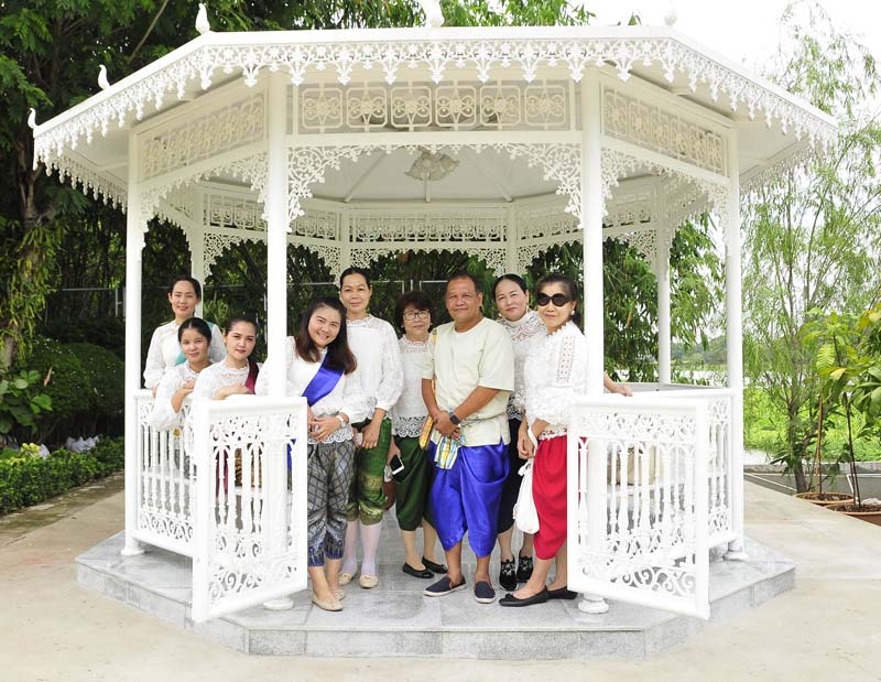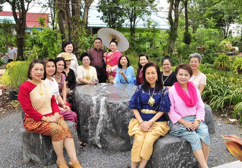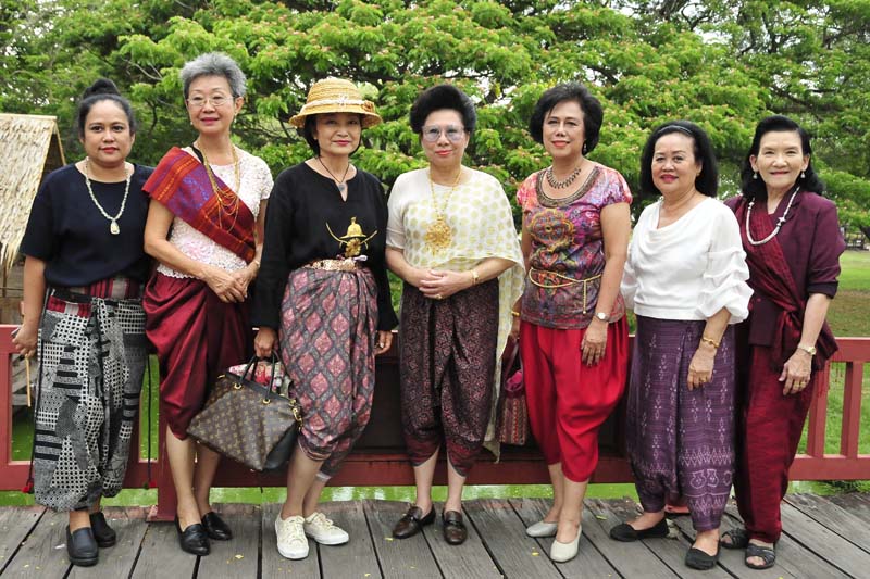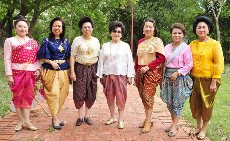 รศ.ดร.วีณา เชิดบุญญชาติ นายกสหสมาคมศิษย์เซนต์ปอล เดอ ชาร์ตร พร้อมด้วย เอื้อมพร ศิริยงค์, อรนุช แสงสุริยจันทร์, สวลี ผกาพันธุ์, ปิยะพัชร์ ไพบูลย์, สุฑาทิพย์ วาทีทิพย์ และ ตวงรัตน์ ศิริยงค์ งดงามในชุดไทยย้อนยุคอย่างสวยงาม