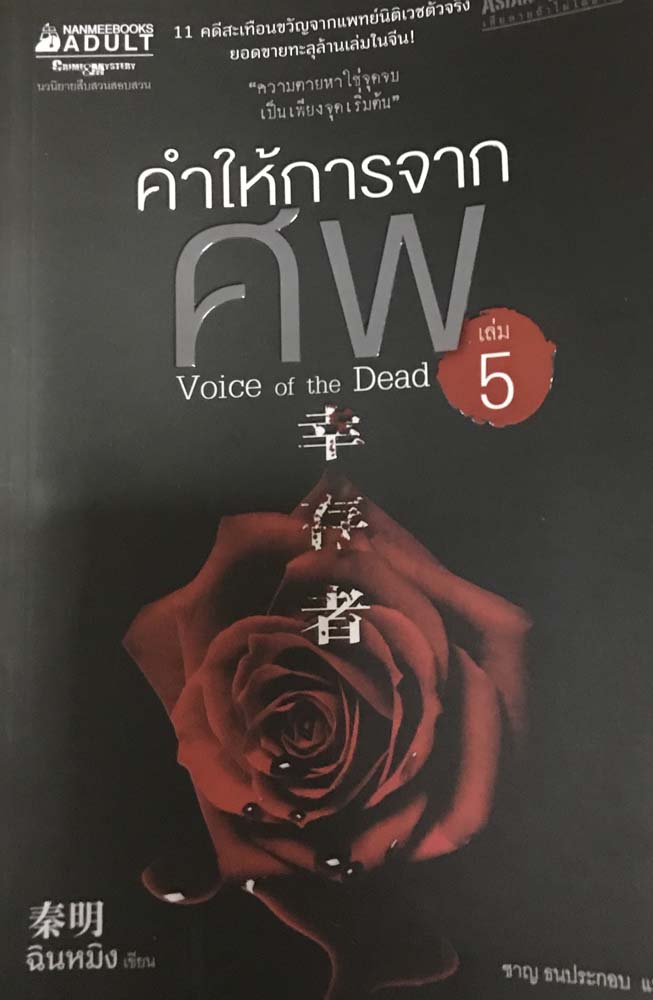 “คำให้การจากศพ เล่ม 5” เป็นภาคต่อของชุด รวมคดี11 คดีจากแฟ้มของนิติเวชกรมตำรวจ จากปลายปากกาของแพทย์นิติเวช ฉินหมิงและพรรคพวกต้องเผชิญกับคดีฆาตกรรมปริศนาต่อเนื่องของฆาตกรที่เลือดเย็นและโหดเหี้ยมที่สุด คือฆ่าคนโดยไม่ต้องมีแรงจูงใจ เหตุการณ์เกิดขึ้นแบบคู่ขนานในสองเมือง เหยื่อลักษณะเดียวกันแต่วิธีฆ่าต่างกัน นิยายสืบสวนเรื่องนี้แตกต่างจากทั่วไปเพราะว่าเบาะแสต่างๆ เริ่มต้นจากศพ และสอดแทรกความรู้เรื่องนิติเวชเข้าไปด้วย เหมาะสำหรับผู้ชอบนิยายที่ตีแผ่ด้านมืดของมนุษย์ และผู้สนใจนิติวิทยาศาสตร์ ราคา 295 บาท