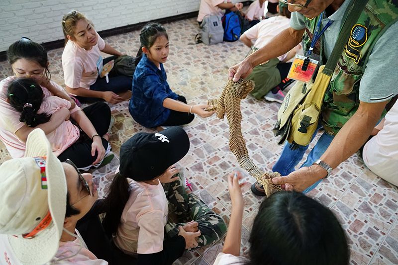 ส่วนช่วงเช้าของวันที่สองทีมนักวิจัยงูจากประเทศอังกฤษได้มาชวนน้องๆ เรียนรู้และศึกษาธรรมชาติของงูแต่ละสายพันธุ์ รวมถึงวิธีการป้องกันตัวจากการถูกงูกัด ส่วนสายๆ จะเป็นกิจกรรมเดินป่าศึกษาธรรมชาติท่องไพรป่าดิบแล้ง-ป่าเต็งรัง เด็กๆ ก็จะได้เรียนรู้เรื่องของพืชพันธุ์ไม้ต่างๆ ในธรรมชาติจากคุณลุงวิทยากรผู้ใจดี พร้อมกับเรื่องราวที่น่าสนใจอีก มากมาย