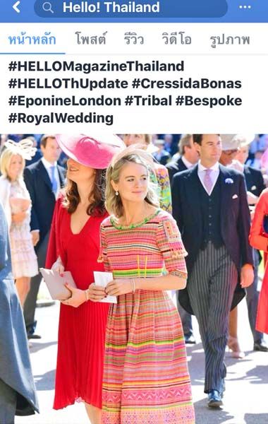 เพจ Hello Thailand ได้โพสต์ข้อความระบุว่า ฝีมือคนไทยไปไกลถึงอังกฤษ! ในงานพิธีเสกสมรสของเจ้าชายแฮร์รี่ และนางสาวเมแกน มาร์เคิลเมื่อวันเสาร์ที่ผ่านมา เราสะดุดตาสาวเครสสิด้า โบนาส อดีตแฟนสาวในเจ้าชายแฮร์รี่ เธอมาในชุดสไตล์ชนเผ่าสั่งตัดจากแบรนด์ Eponine London ซึ่งทางดีไซเนอร์ Jet Shenkman เผยว่า เป็นผ้าคอตตอนทอมือ ฝีมือของชาวเขา จังหวัดเชียงใหม่ ของประเทศไทยนี่เอง