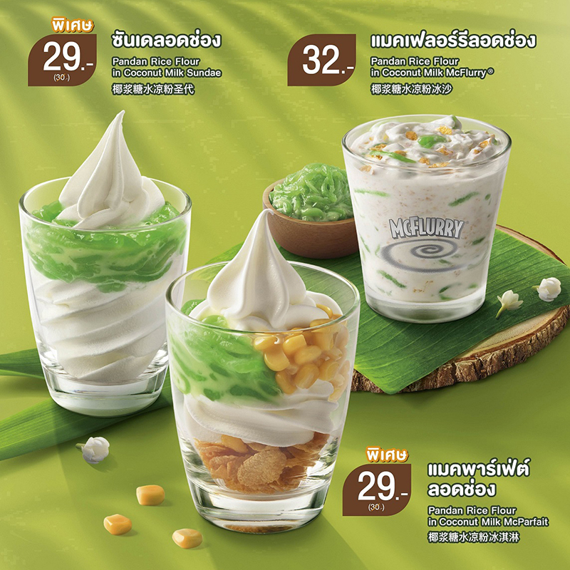 “ไทยหวานเย็น” ชวนชิมไอศกรีมลอดช่อง หอมกะทิและน้ำตาลมะพร้าว อร่อยหวานเย็น คลายร้อน ลงตัวสไตล์ไทย ทั้งซันเดย์ลอดช่อง, แมคพาร์เฟ่ต์ลอดช่อง และแมคเฟลอร์รีลอดช่อง ในราคาเริ่มต้นที่ 29-32 บาท วันนี้-31 พ.ค. หรือจนกว่าสินค้าจะหมด ที่ร้านแมคโดนัลด์ ทุกสาขาที่ร่วมรายการ