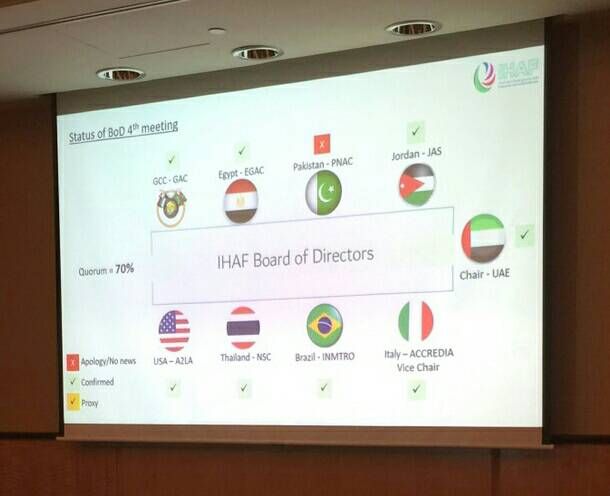 นางสาวจูอะดี กล่าวว่า ทาง IHAF ได้จัดการประชุมคณะกรรมการบริหารครั้งนี้ โดยมี Mr Mohammed AL Shehhi จาก ENAS สหรัฐอาหรับเอมิเรตส์ เป็นประธานในการประชุม ซึ่งกรรมการบริหารชุดนี้ ประกอบด้วย ผู้แทนจากหน่วยรับรองระบบงาน จำนวน 9 หน่วยงาน ได้แก่ 1.Emirates National Accreditation System (ENAS), สหรัฐอาหรับเอมิเรตส์ 2.National Council for Accreditation (EGAC), อียิปต์ 3.Gulf Accreditation Center (GAC) กลุ่มประเทศอ่าวอาหรับ 4.Jordanian Accreditation System (JAS), จอร์แดน 5.Pakistan National Accreditation Council (PNAC), ปากีสถาน 6.National Bureau of Agricultural Commodity and Food Standards (ACFS/NSC) Thailand 7.American Association for Laboratory Accreditation (A2LA) สหรัฐอเมริกา 8.INMTRO, บราซิล และ9.Accredia, อิตาลี